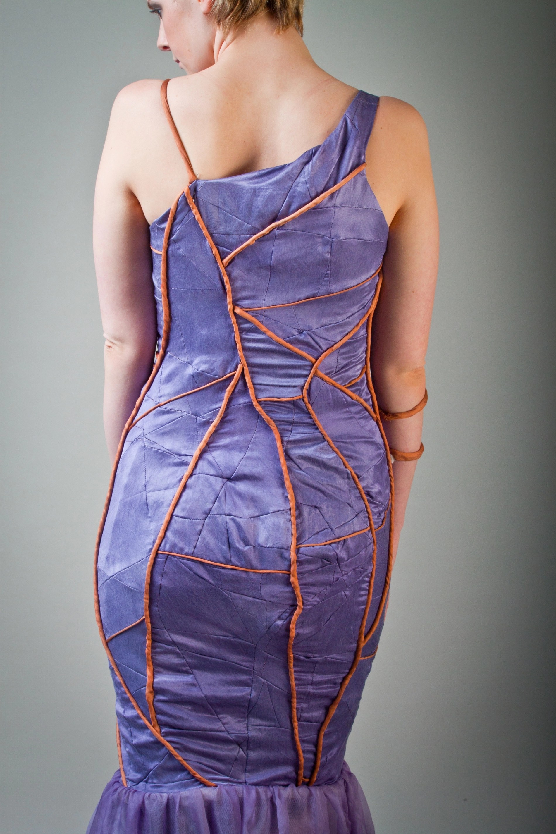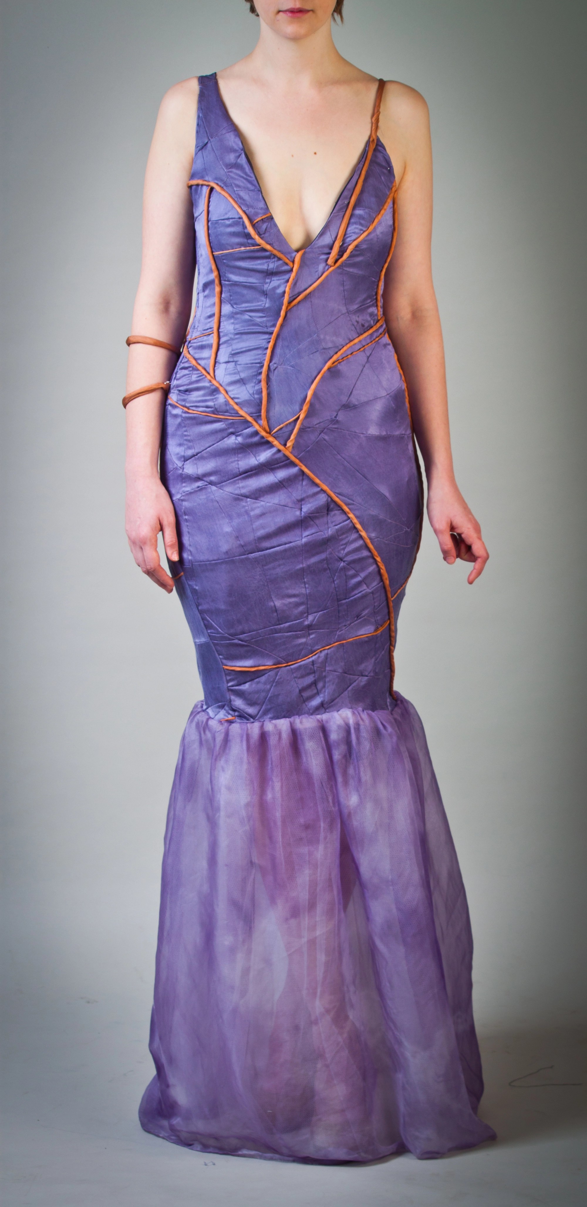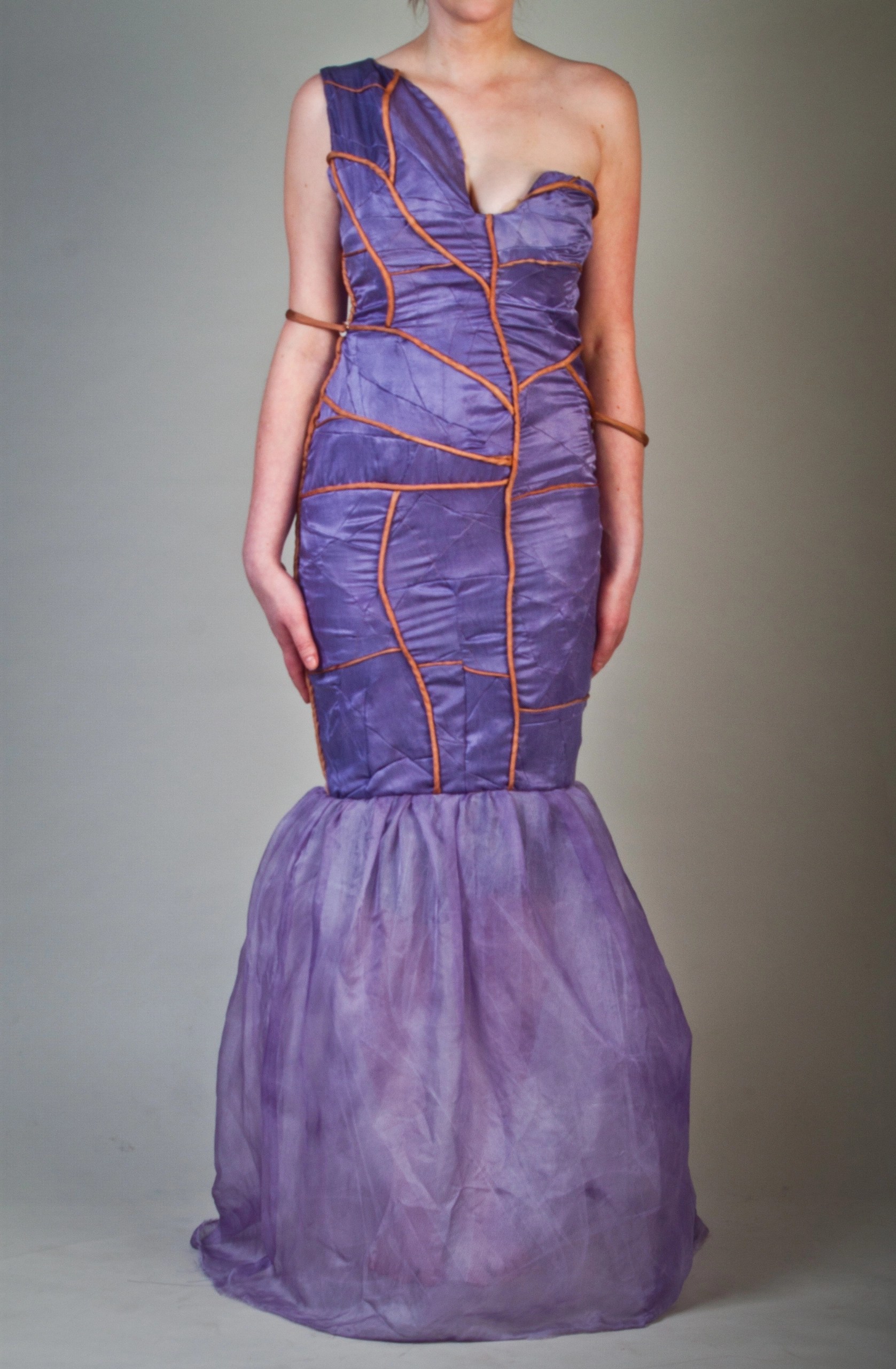 Cotton/Silk blend dyed with logwood purple, silk piping dyed with madder and black tea, silk organza dyed with logwood purple