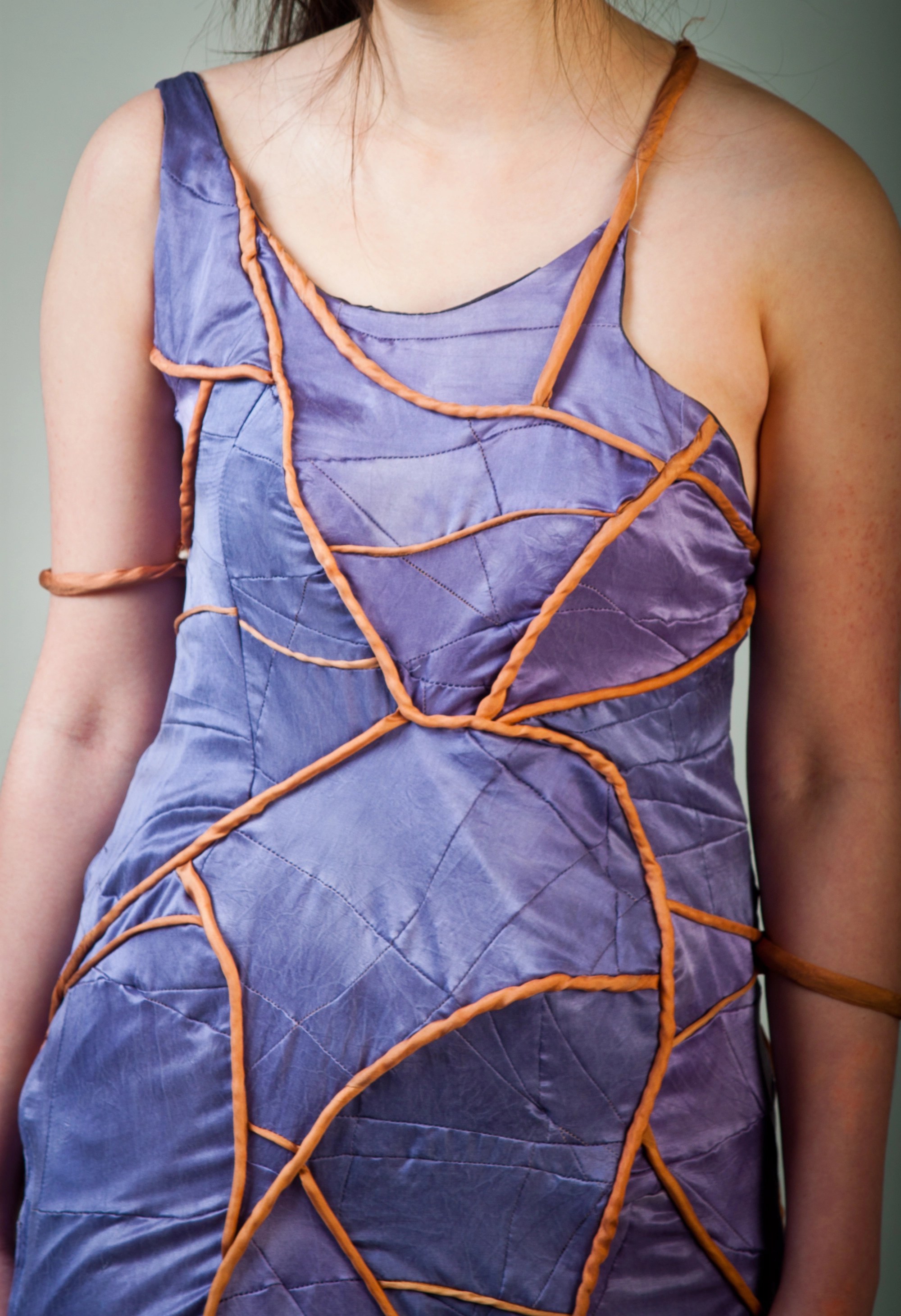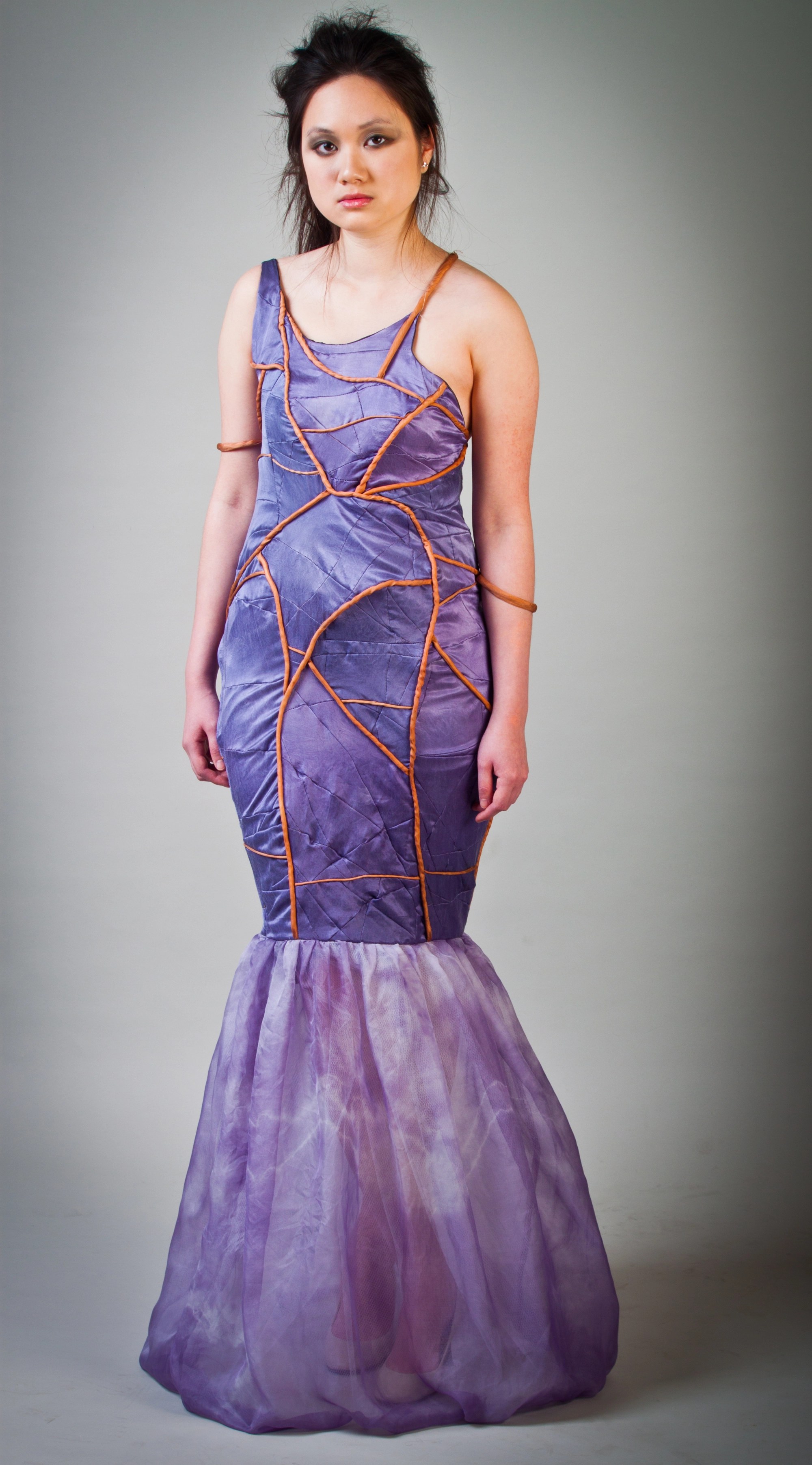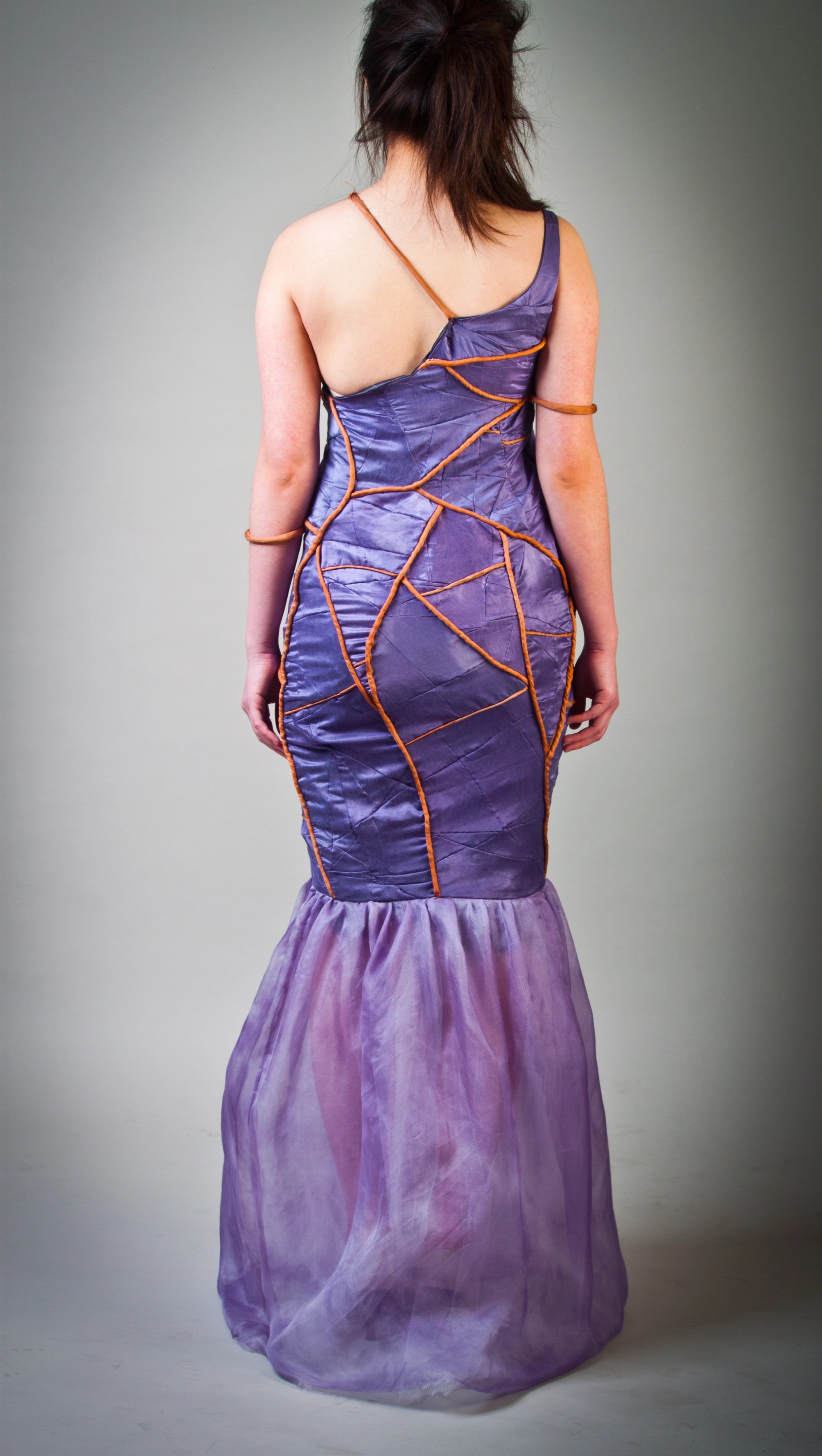 Cotton/Silk blend dyed with logwood purple, silk piping dyed with madder and black tea, silk organza dyed with logwood purple
