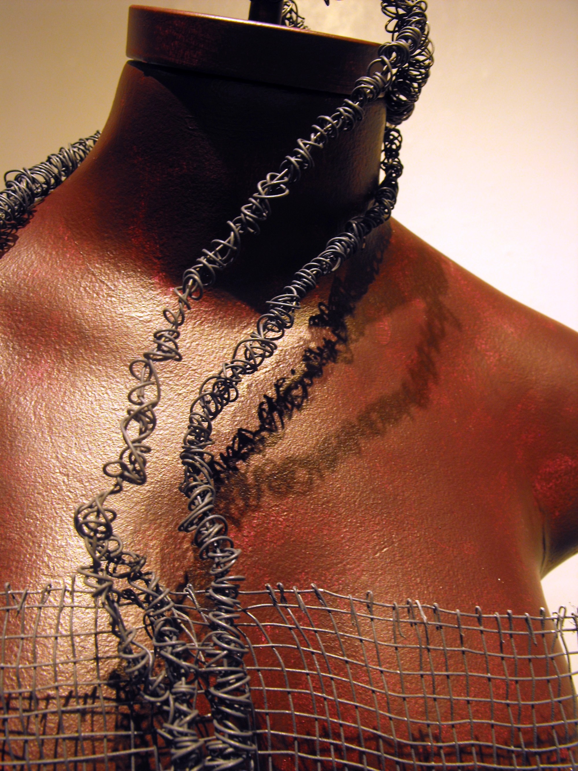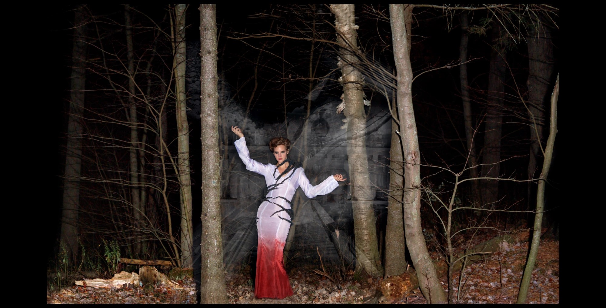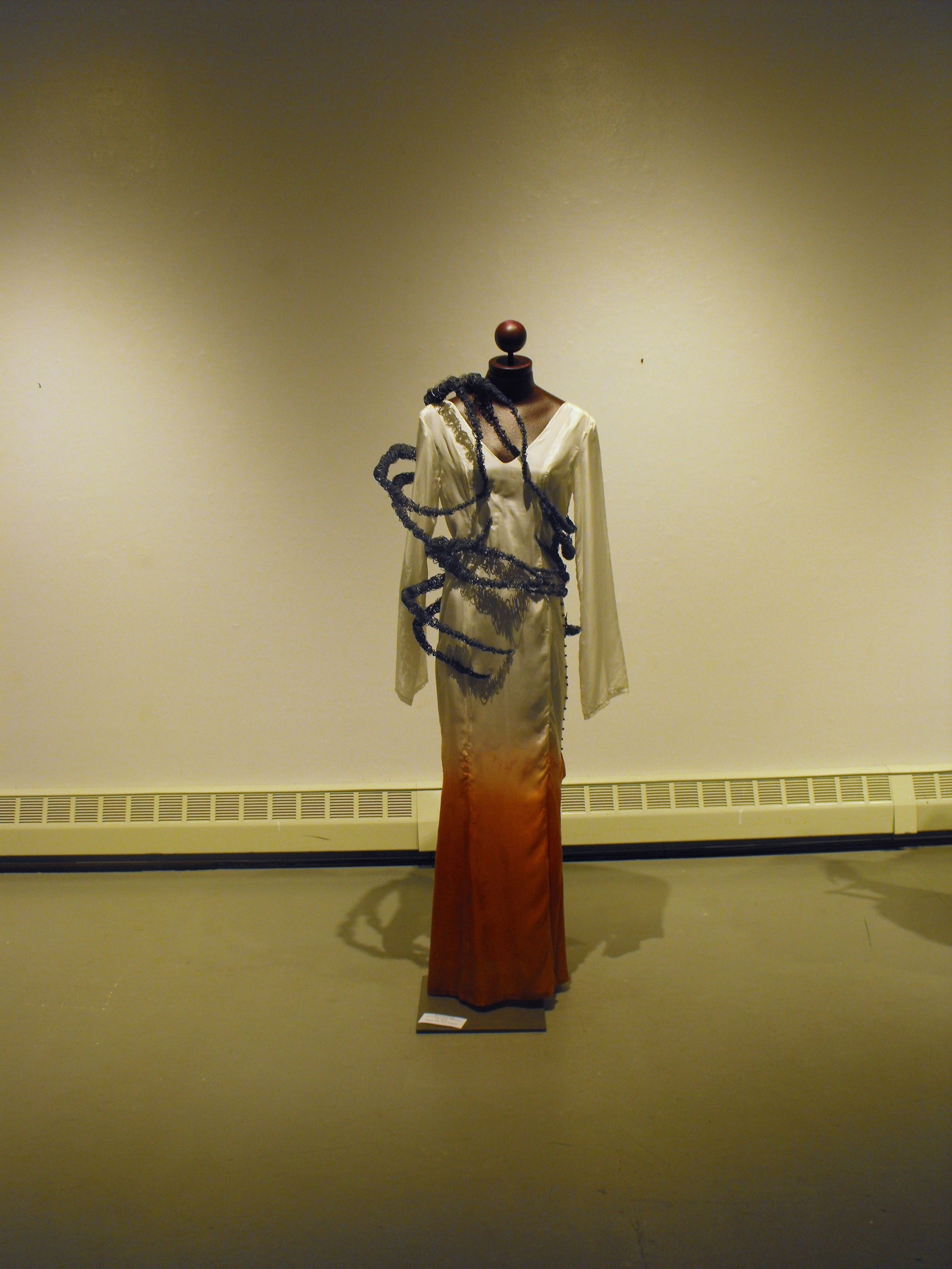 The colours of the garments shift from white to a deep red. White is commonly associated with innocence, and in this case that remains. Accompanying this are wire forms that eventually transition from uncomfortable claws and legs to a constricting garment. The wire interrupts the white silk to show the breakdown of innocence, with the red appearing as the spiders become more human. Humans are one of the only creatures that create their clothing, so garments are linked with humanity for me. The wire then becomes a garment to show the shift from monster to human, but also a reminder to the viewer of what once was.