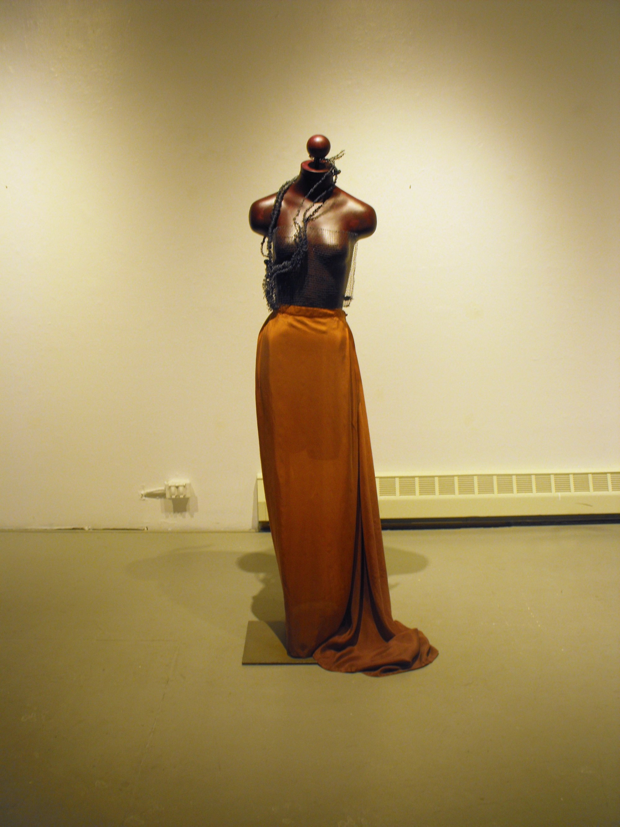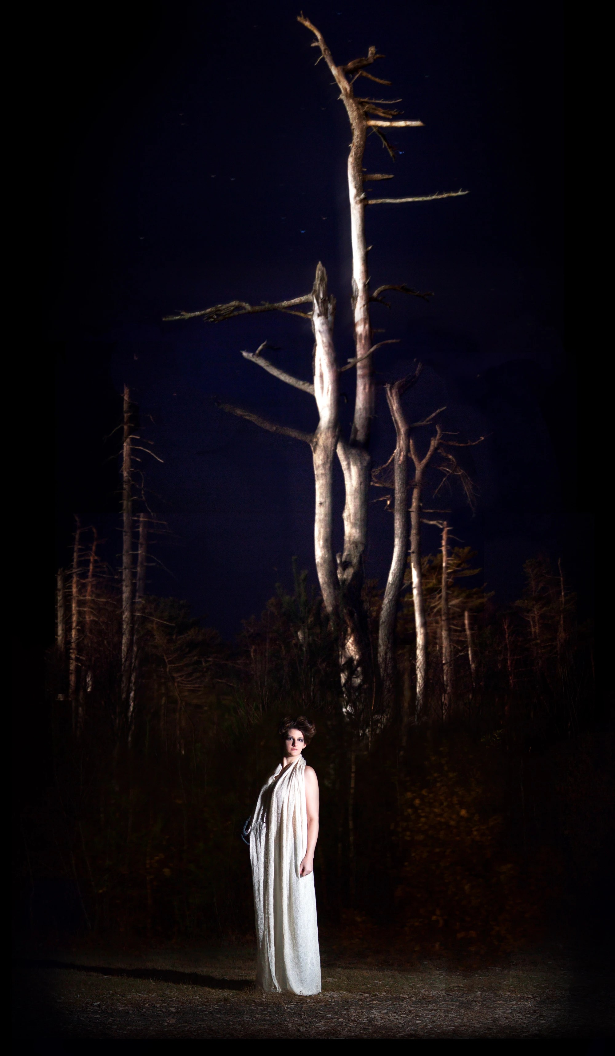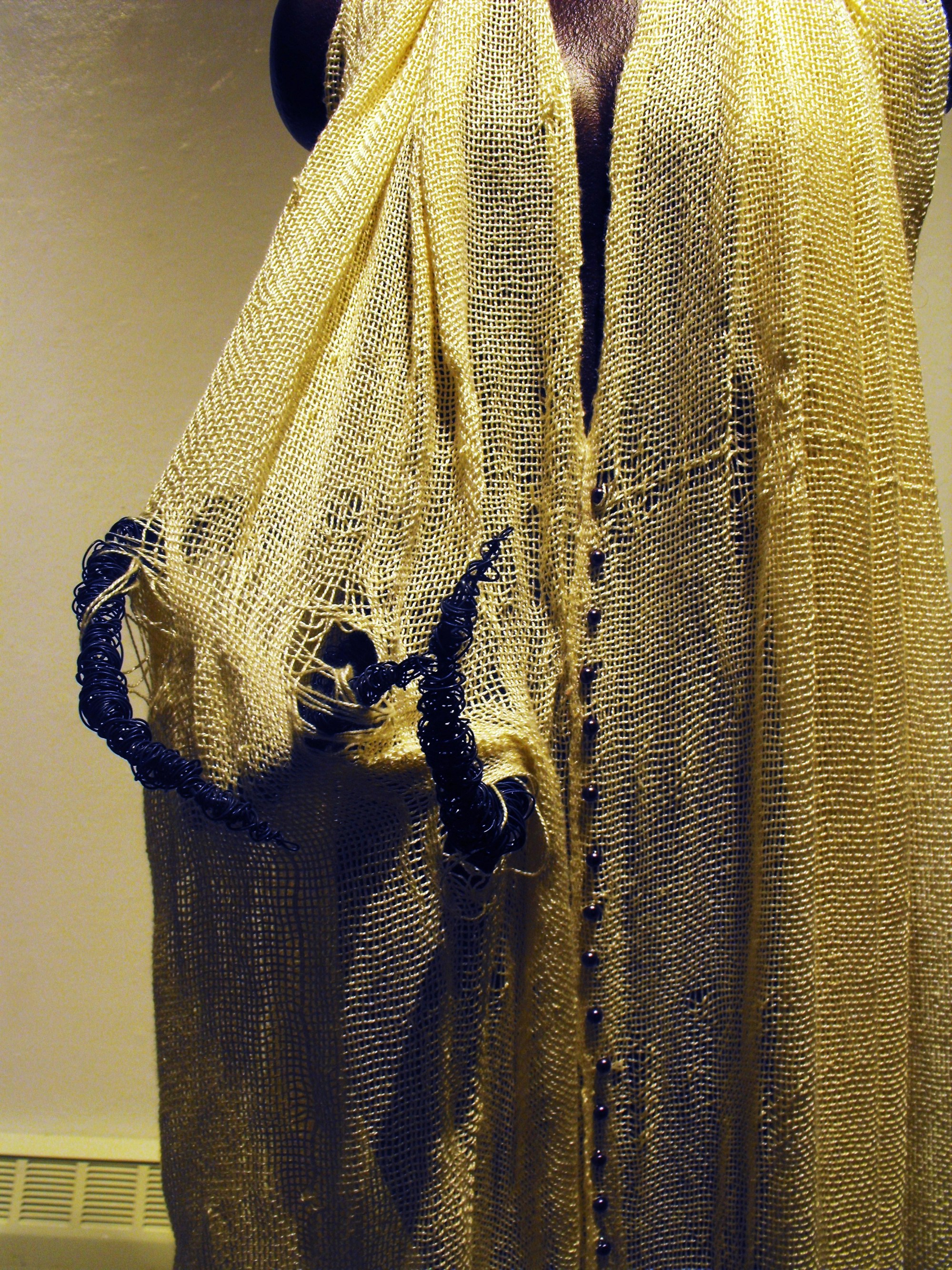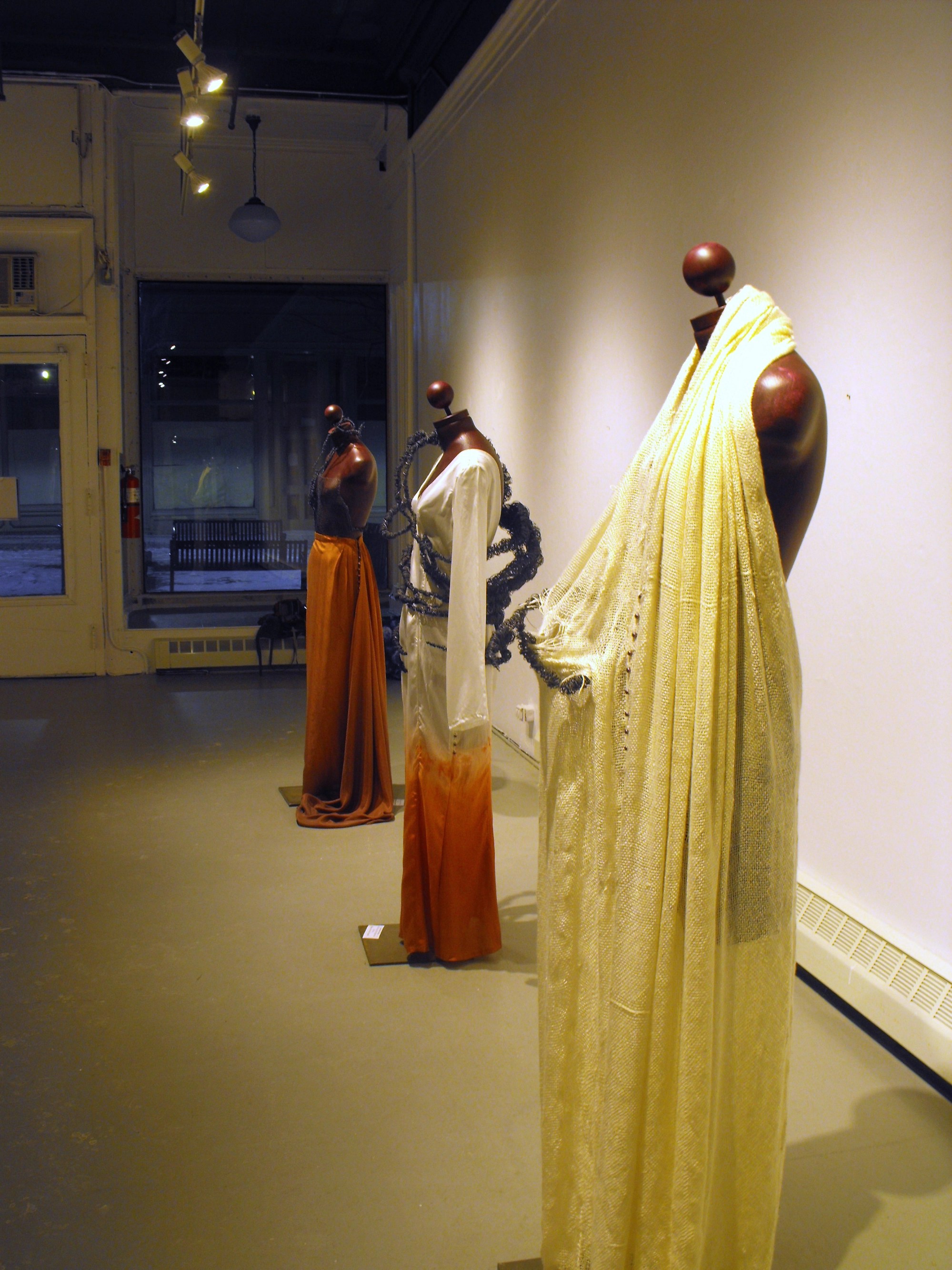 The colours of the garments shift from white to a deep red. White is commonly associated with innocence, and in this case that remains. Accompanying this are wire forms that eventually transition from uncomfortable claws and legs to a constricting garment. The wire interrupts the white silk to show the breakdown of innocence, with the red appearing as the spiders become more human. Humans are one of the only creatures that create their clothing, so garments are linked with humanity for me. The wire then becomes a garment to show the shift from monster to human, but also a reminder to the viewer of what once was.