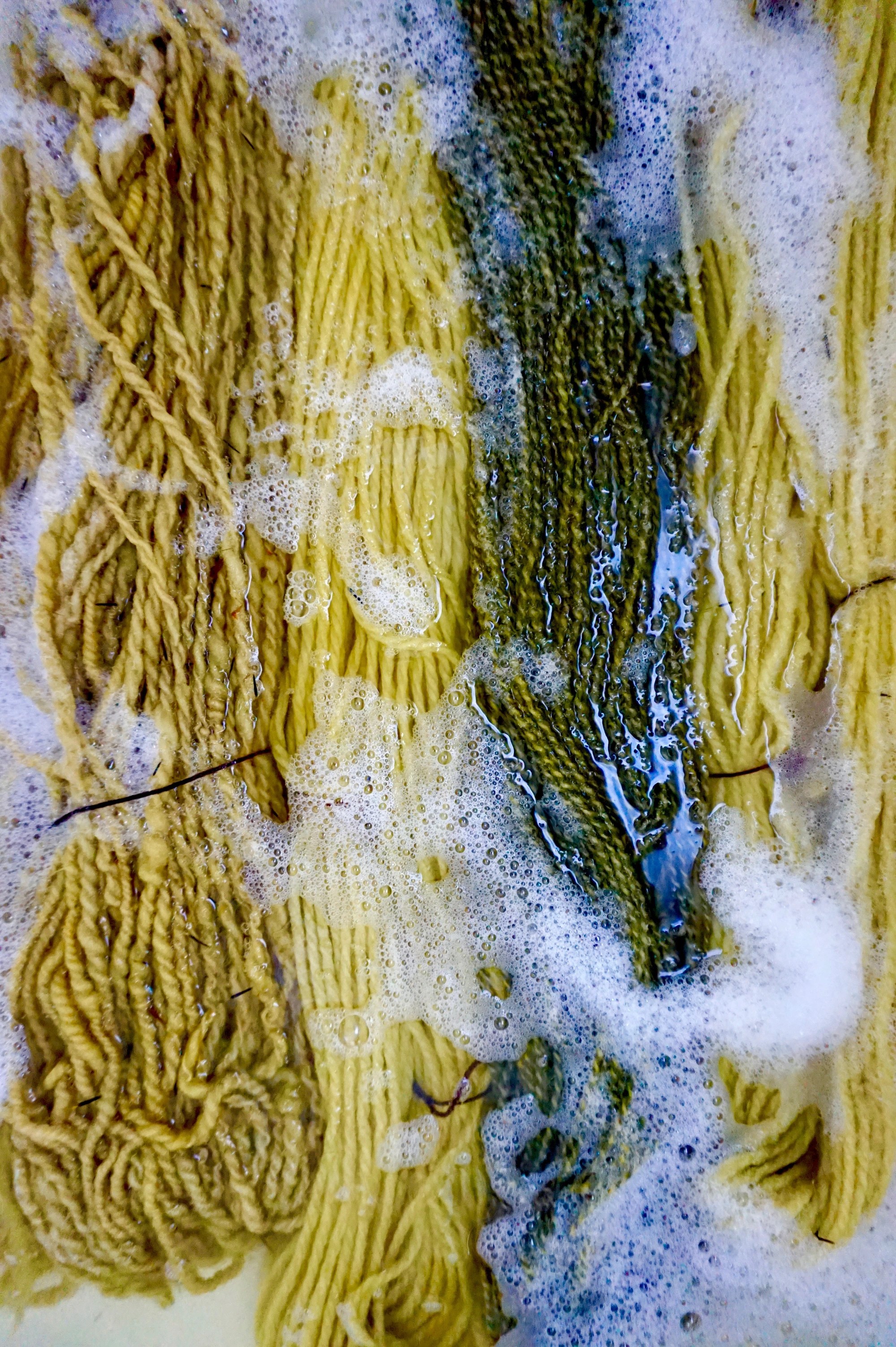 Since I was dyeing so much wool in this bath, I turned the heat off and left it overnight with the lid on to hold the heat. 24 hours later I repeated the heating process a second time (turn on low heat, bring up to 70c, leave for 90 minutes monitoring temperature, and turn off heat). I left the yarn to sit in the dye bath for an additional 72 hours off-heat until I rinsed it out. Unlike chemical dyes, your natural dyes will continue to add more color to the yarn as they cool off and sit in the water. A word of warning: dye CAN and WILL mould if you leave it too long.