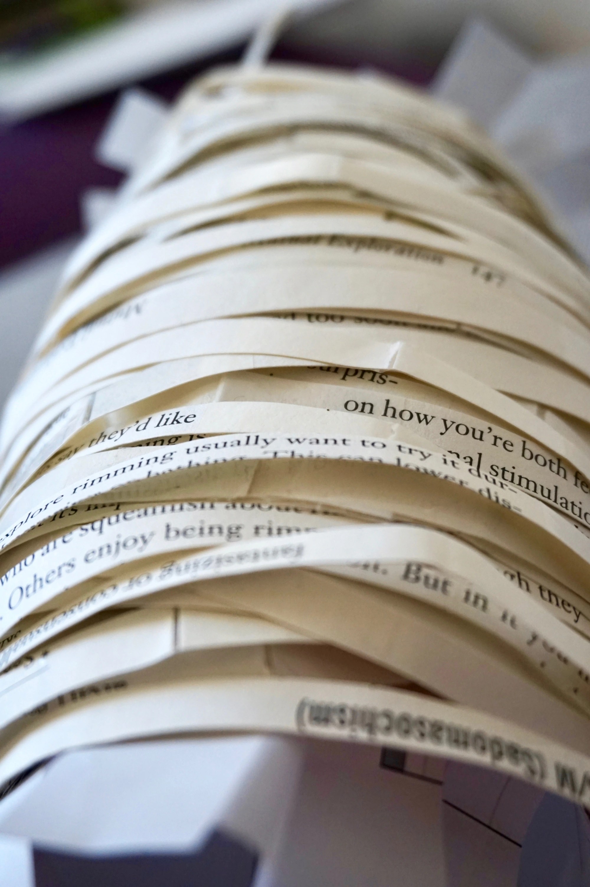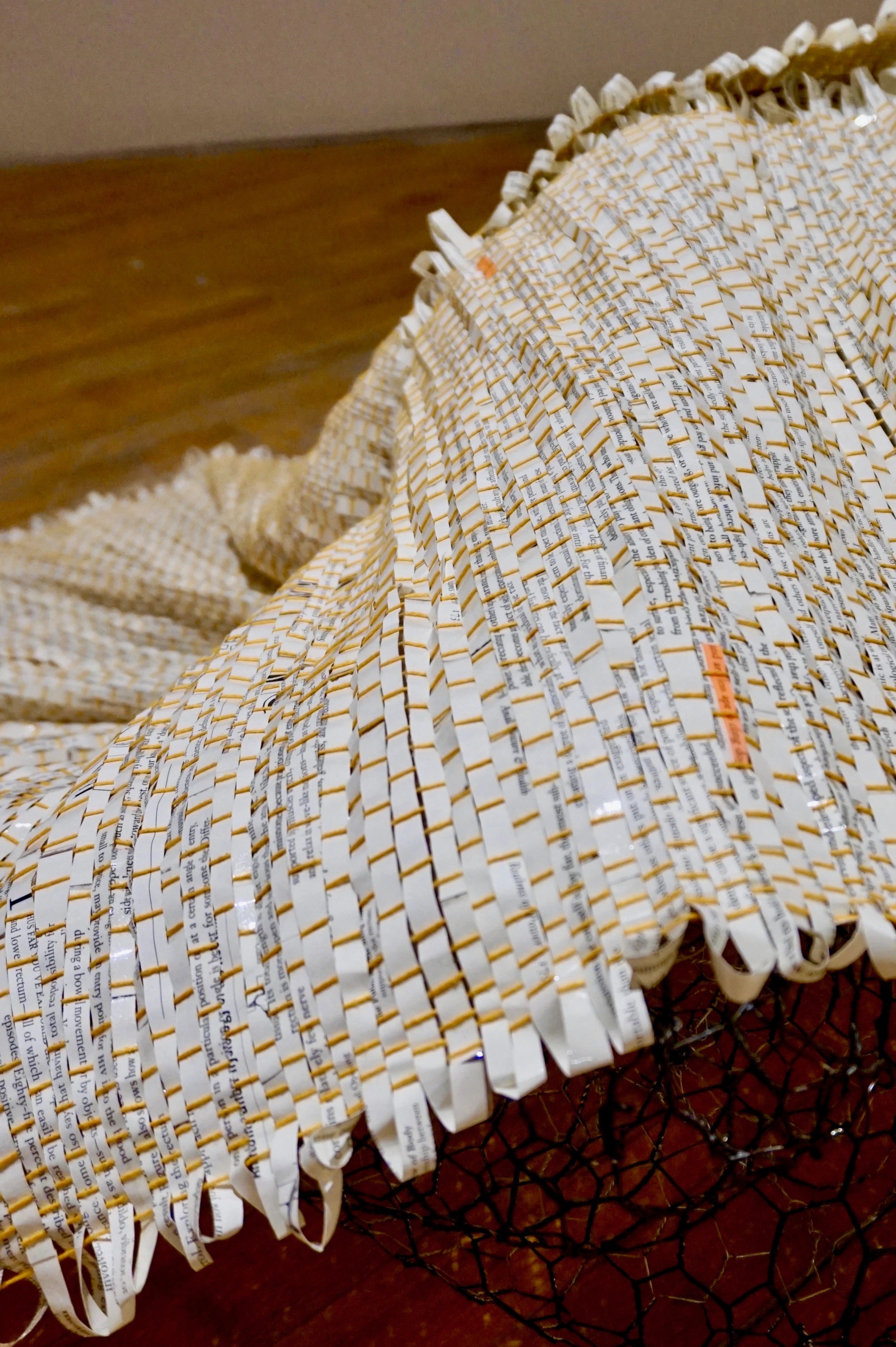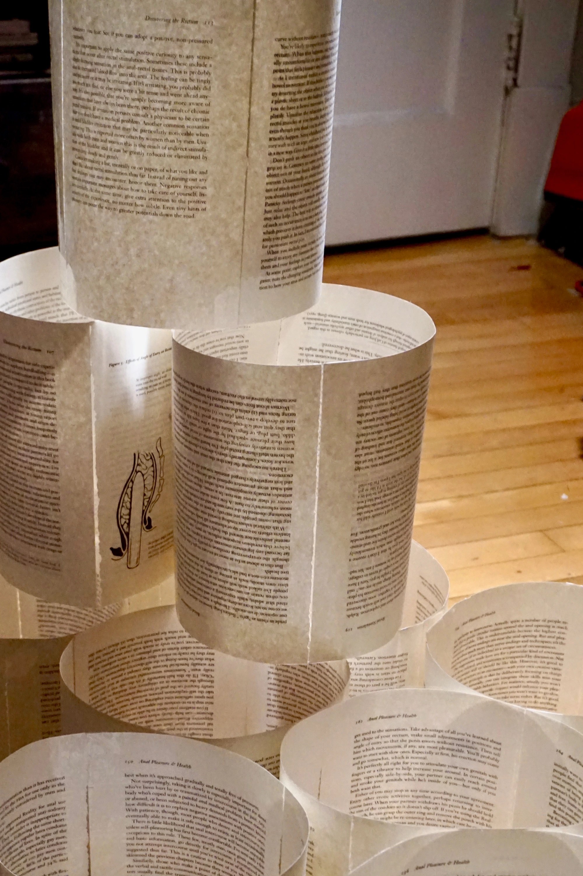 I was donated the book Anal Pleasure and Health by Jack Morin as part of my project. In his early 30s, my contributor had the realization that he was bisexual, and his family was not accepting of his sexual identity. His niece (who was in her 20s) gave him her book as a token of acceptance. Shortly thereafter, she was killed in a car accident. I had previously made a piece in this series about the sexuality aspect of this heartbreak object, and I set out to create a piece to tackle the second layer in the object: the grief of losing his niece. The paper became a shell, a blanket, a covering nearly obscuring a life-size human form underneath. Grief changes us, it immobilizes us. Everything stops.