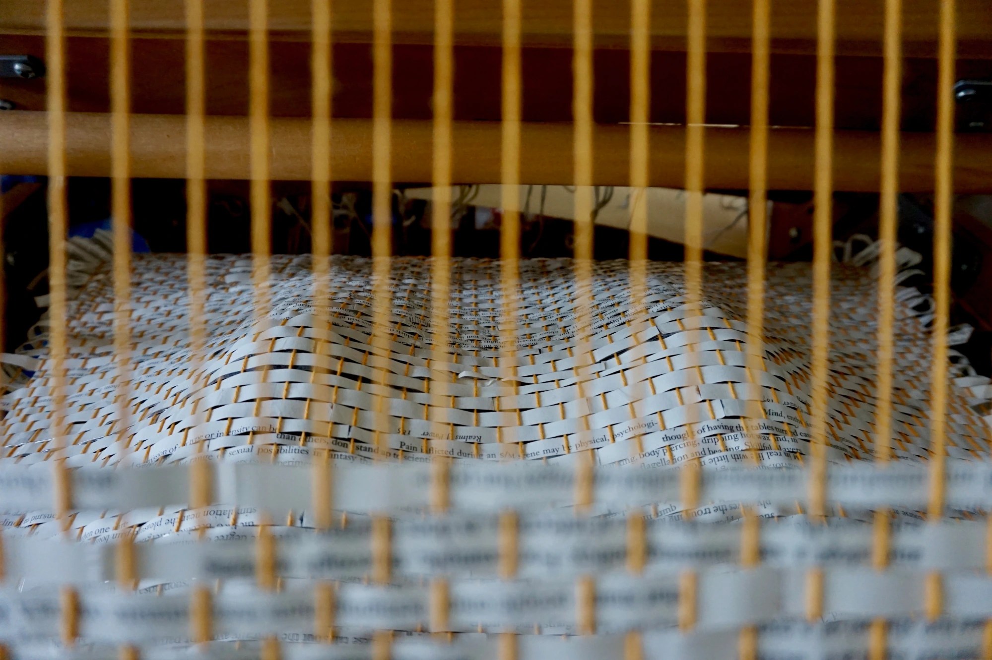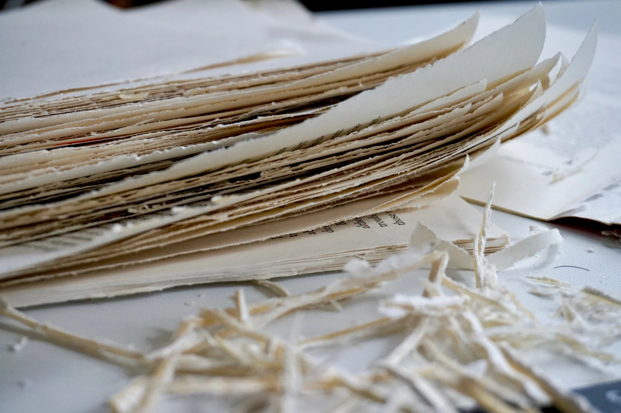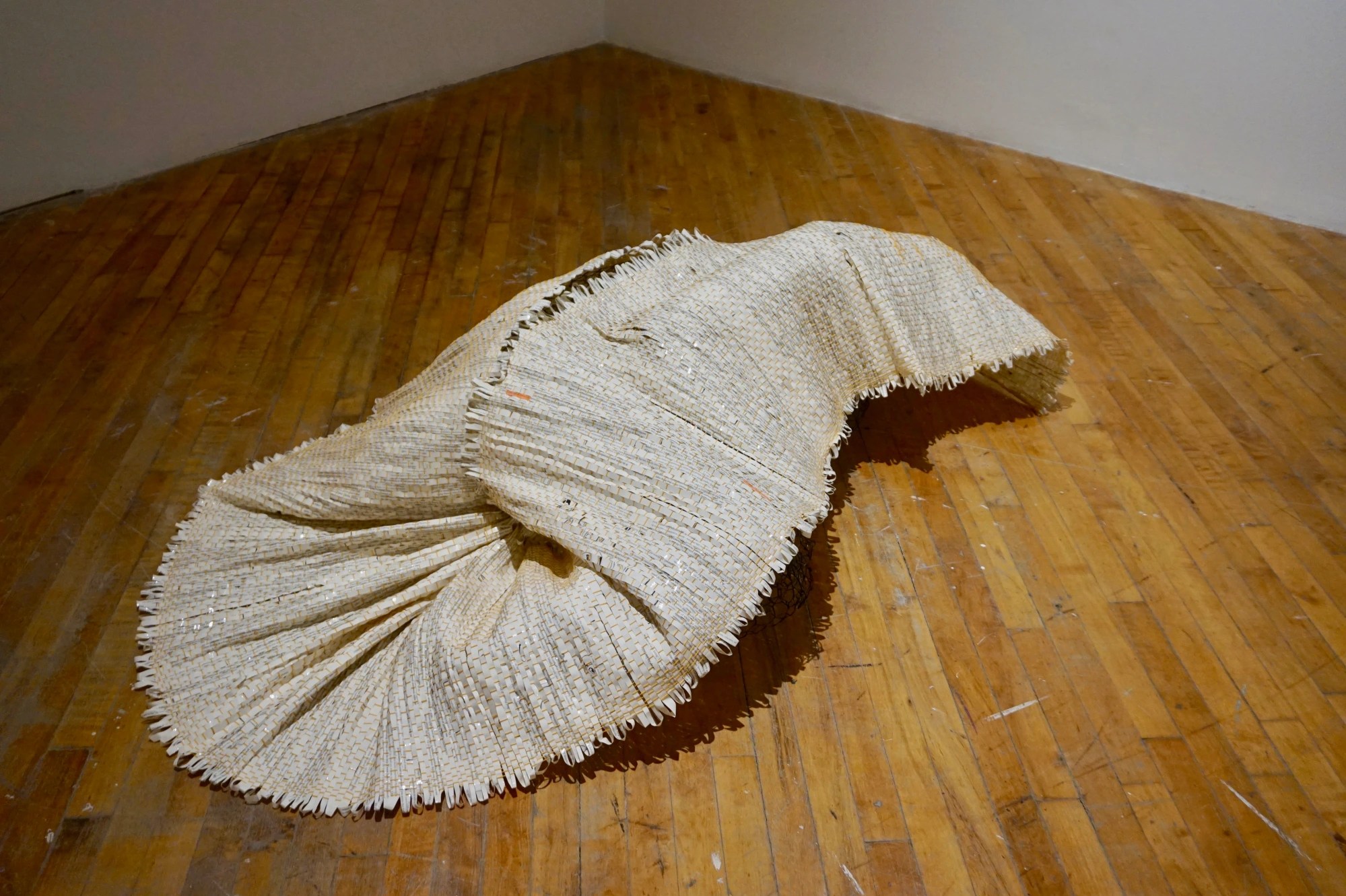 I was donated the book Anal Pleasure and Health by Jack Morin as part of my project. In his early 30s, my contributor had the realization that he was bisexual, and his family was not accepting of his sexual identity. His niece (who was in her 20s) gave him her book as a token of acceptance. Shortly thereafter, she was killed in a car accident. I had previously made a piece in this series about the sexuality aspect of this heartbreak object, and I set out to create a piece to tackle the second layer in the object: the grief of losing his niece. The paper became a shell, a blanket, a covering nearly obscuring a life-size human form underneath. Grief changes us, it immobilizes us. Everything stops.