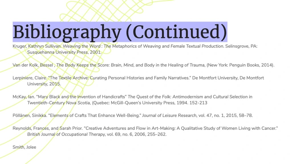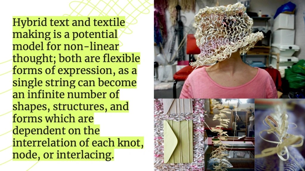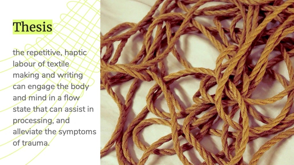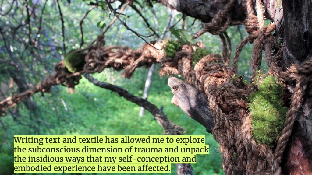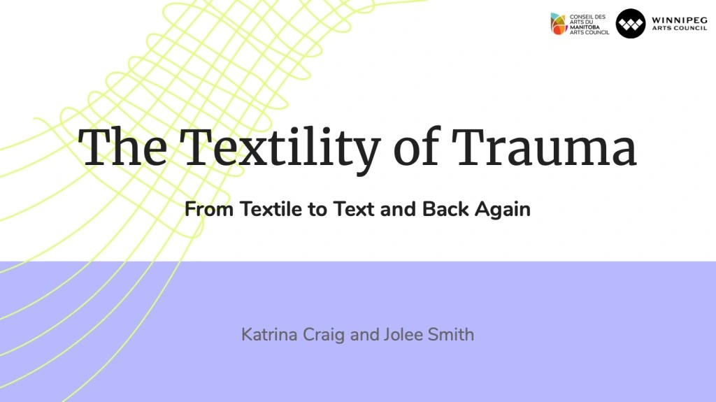 “Katrina Craig and Jolee Smith will give a joint presentation on their independent creative practices, which both deal with hybrid text and textile methodologies in relation to trauma. In her studio practice, Katrina repurposes written text as the material for her textiles work, whereas Jolee has been drawing on the techniques of textile practices as an approach to writing text. The movement between text and textile will be a theme throughout the presentation, as we interlace mediums and disciplines. We will position the aforementioned creative methodologies within trauma studies, literary theory, critical craft studies, and women’s histories. By drawing on these discourses and our own material practices, we propose that weaving text and textile practices offers a unique potential in its ability to aid the maker in processing trauma.”