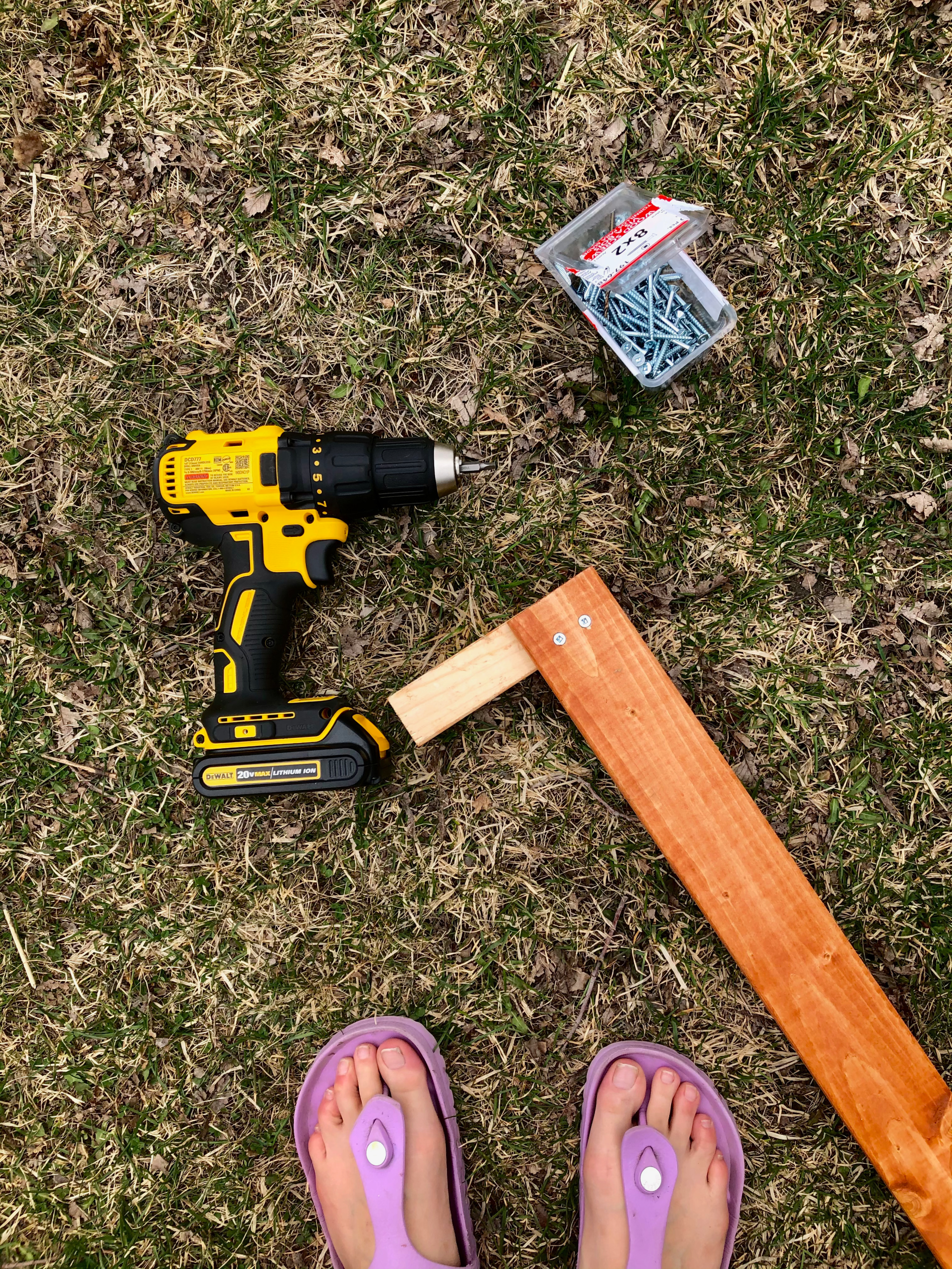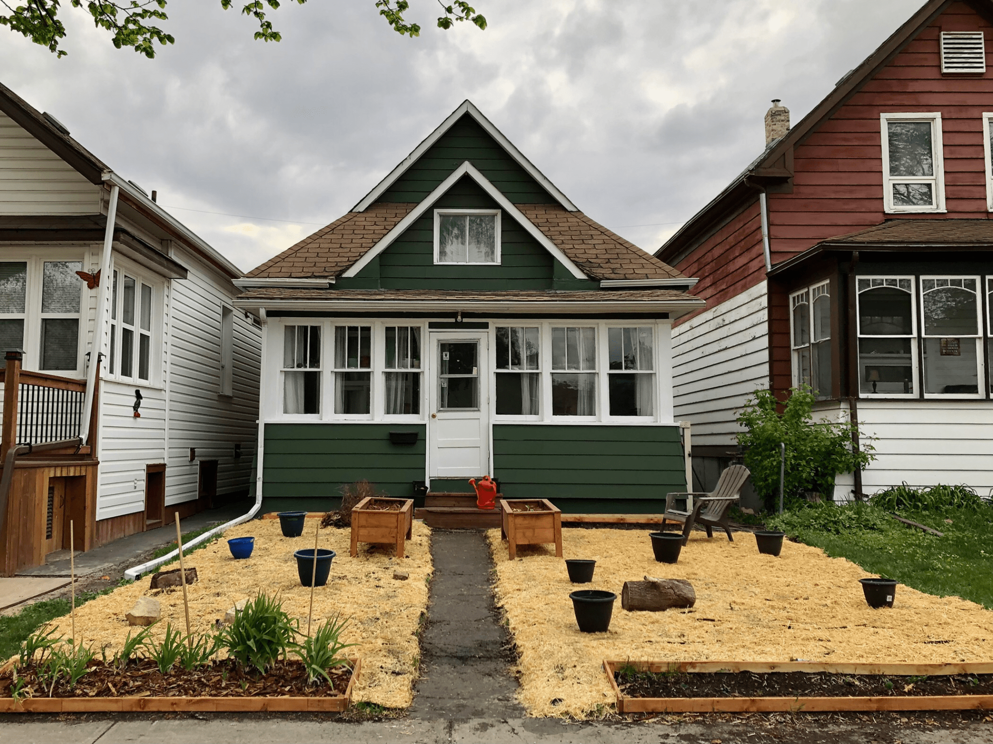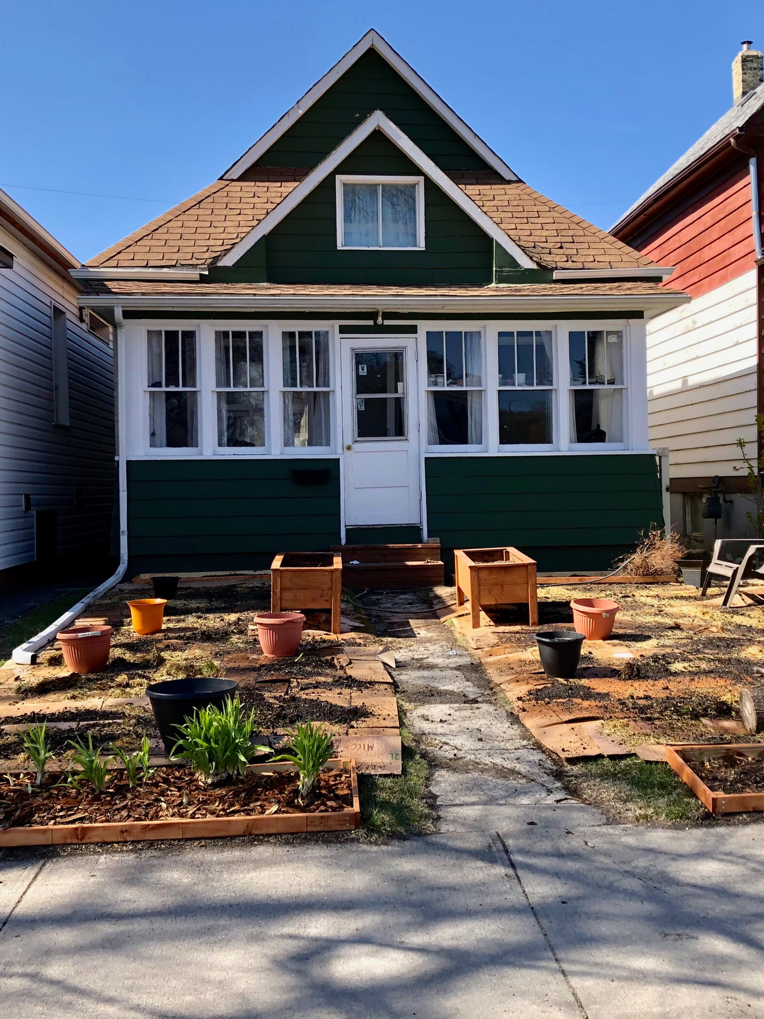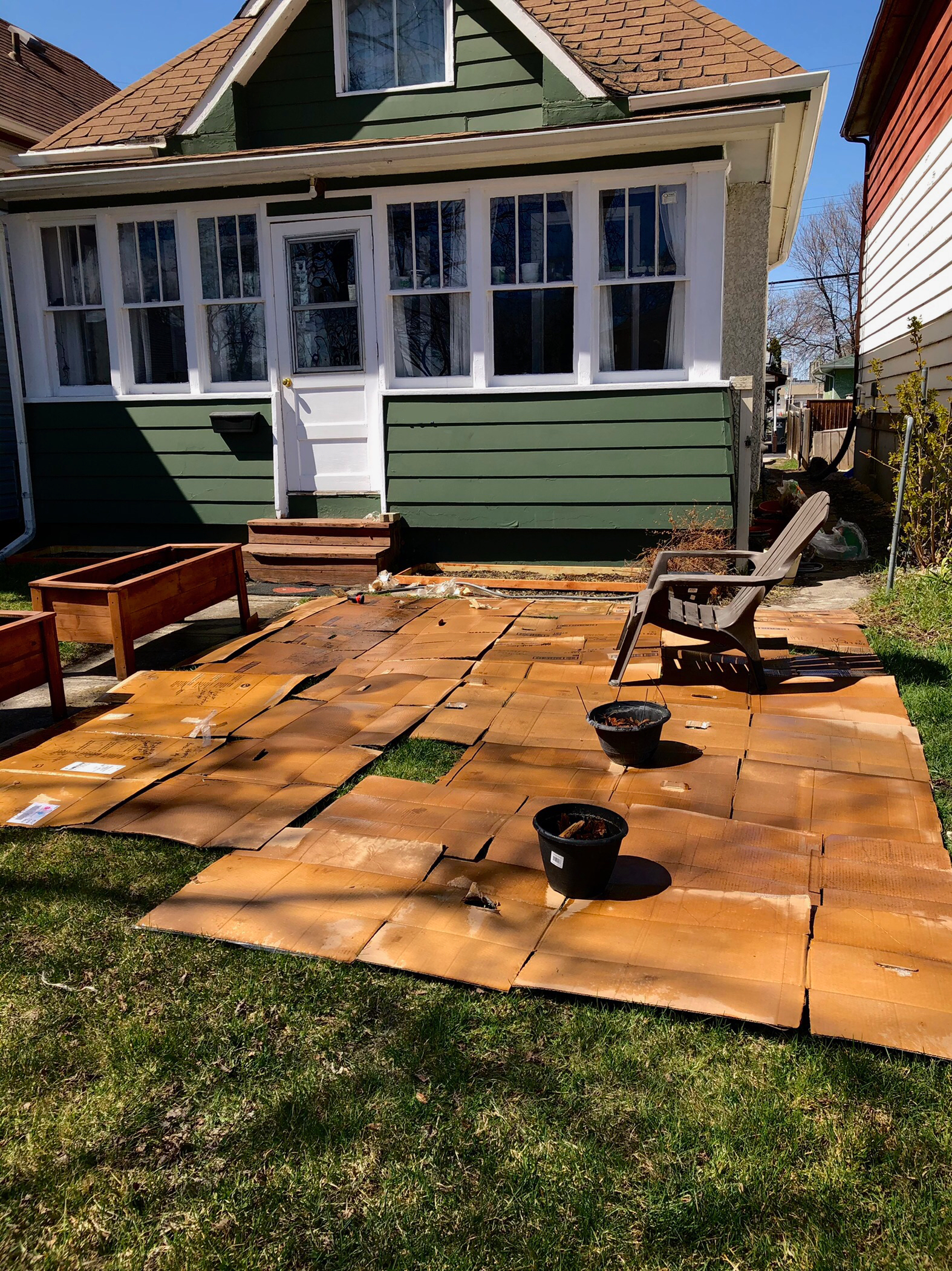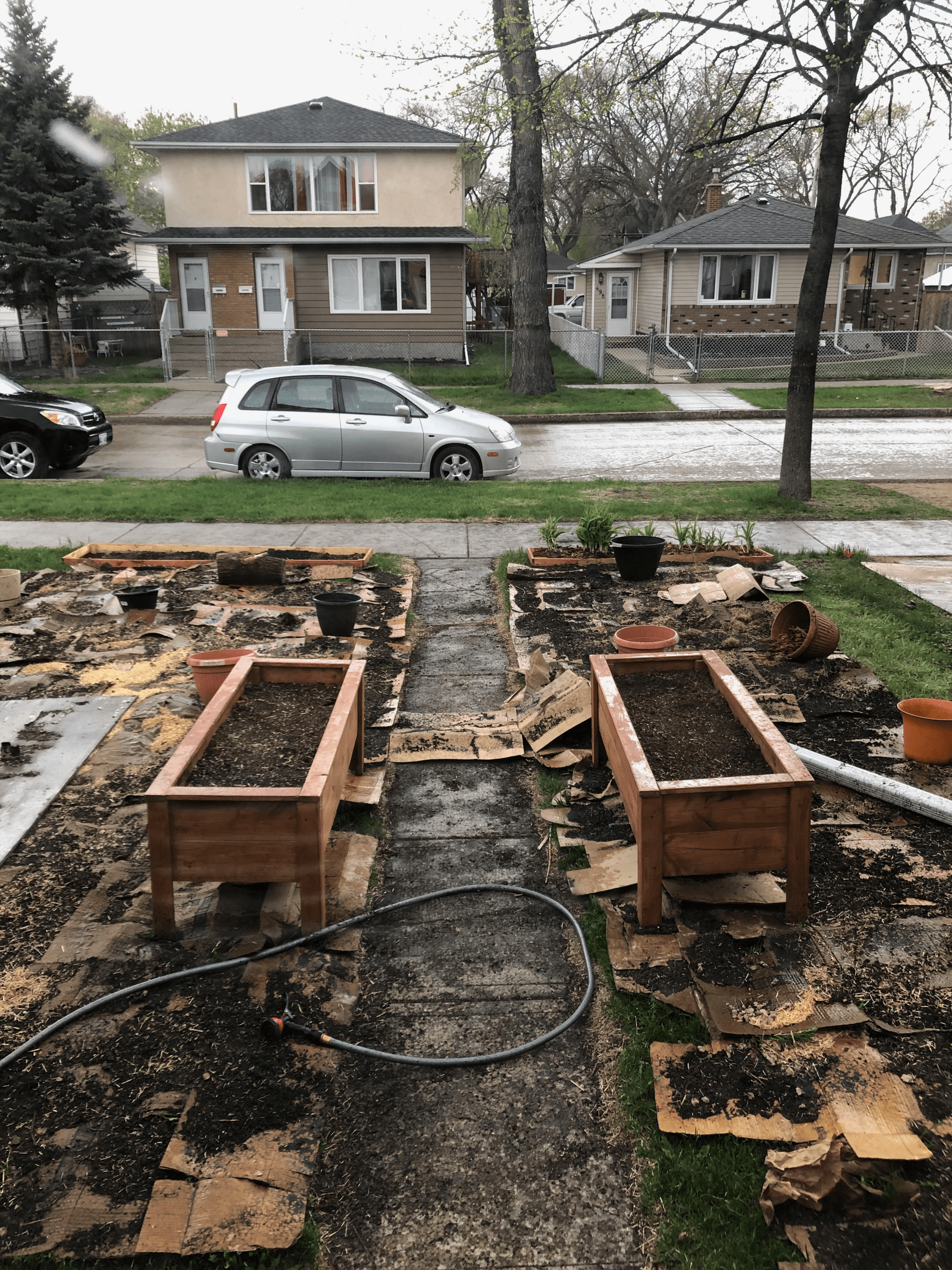 Some process photos of the first few stages of front lawn-to garden-transition. There were already two beds in front of the house, and the two freestanding boxes when we moved in. I removed the sod, dug out the front beds, and made the wooden edging, staining it to match the boxes. I dug out the corners and put the edging in place.