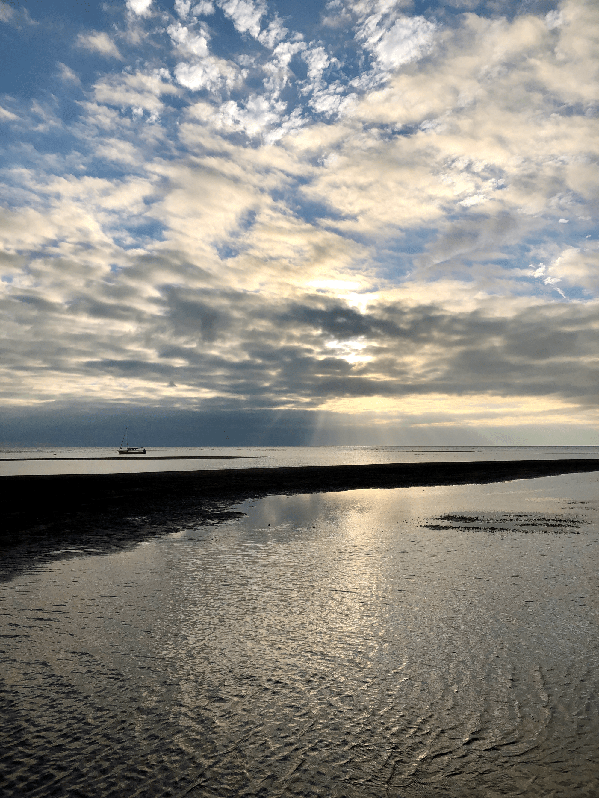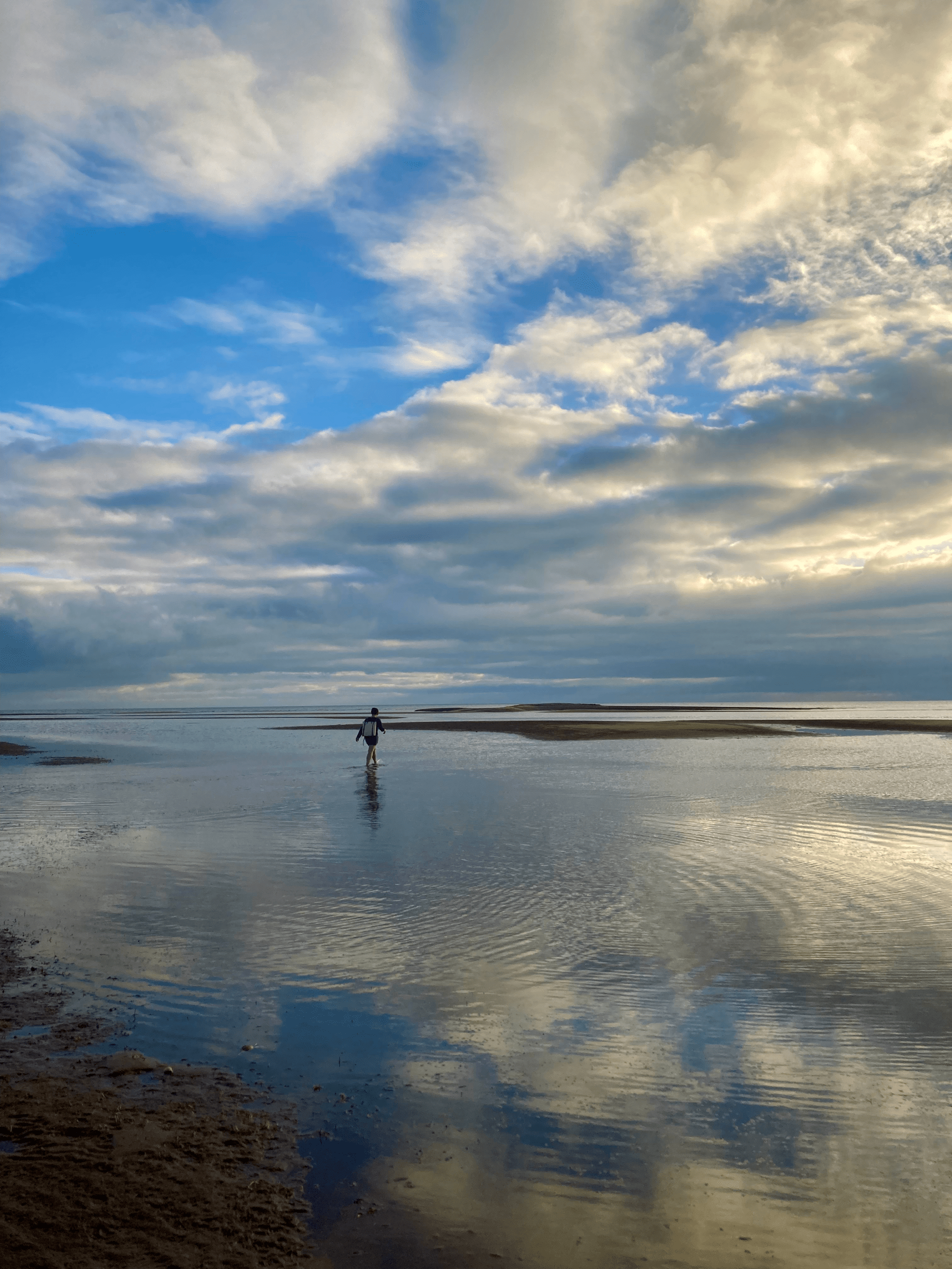 The moon tide brought the sand bars to the surface. Walked across the seabed to a shell reef exposed from the extreme low tide. Giggles in the car with friends.