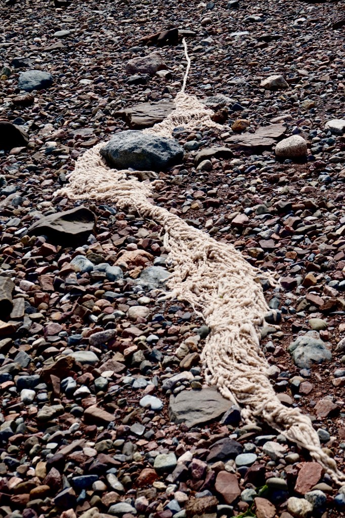 These works are installed in specific natural environments and surrendered to the environment they are placed in, removing the control of the artist and welcoming external forces in shaping the final form. The elements slowly change the works, passively dyeing, staining, matting the wool, losing and gaining material.