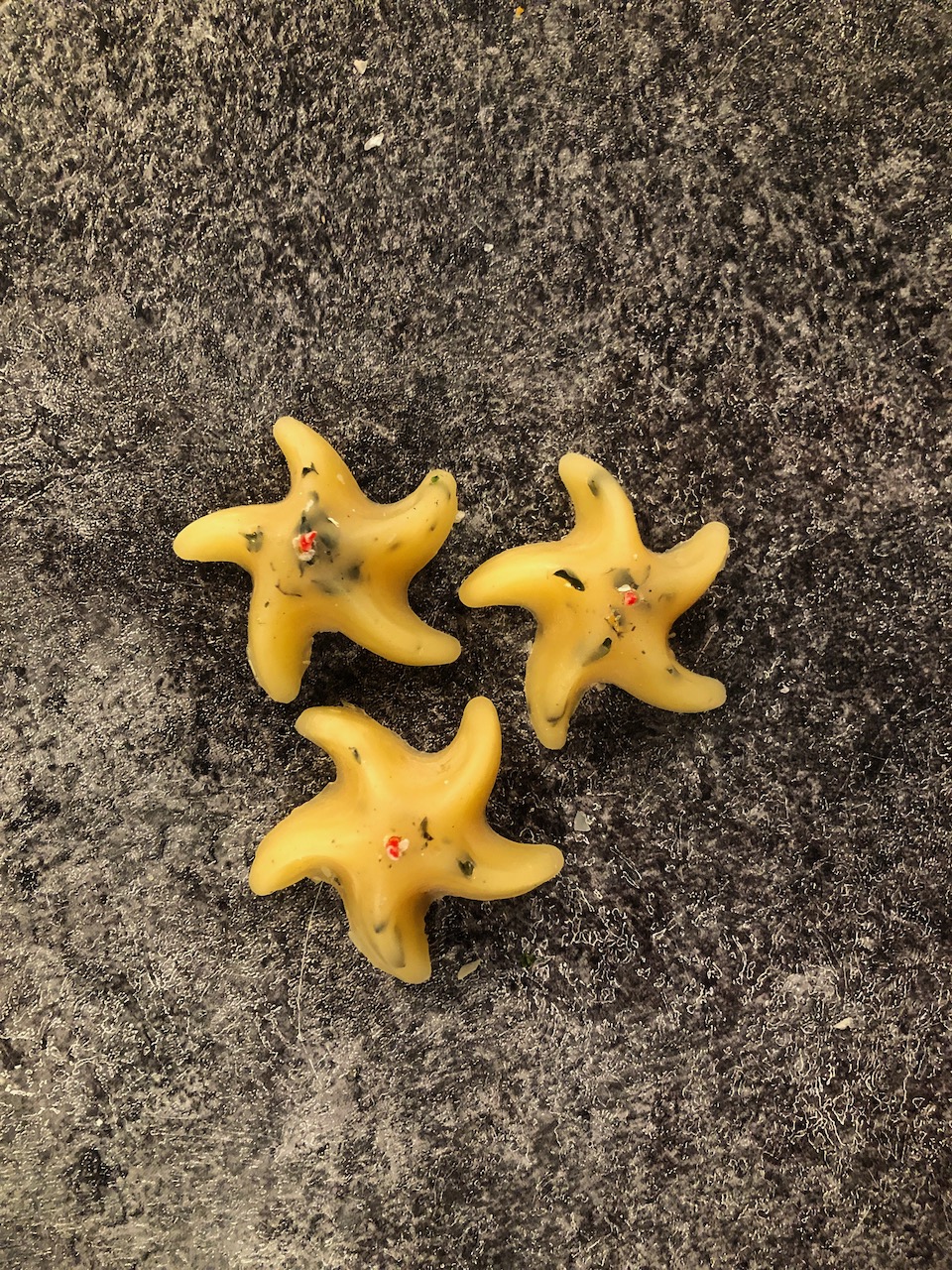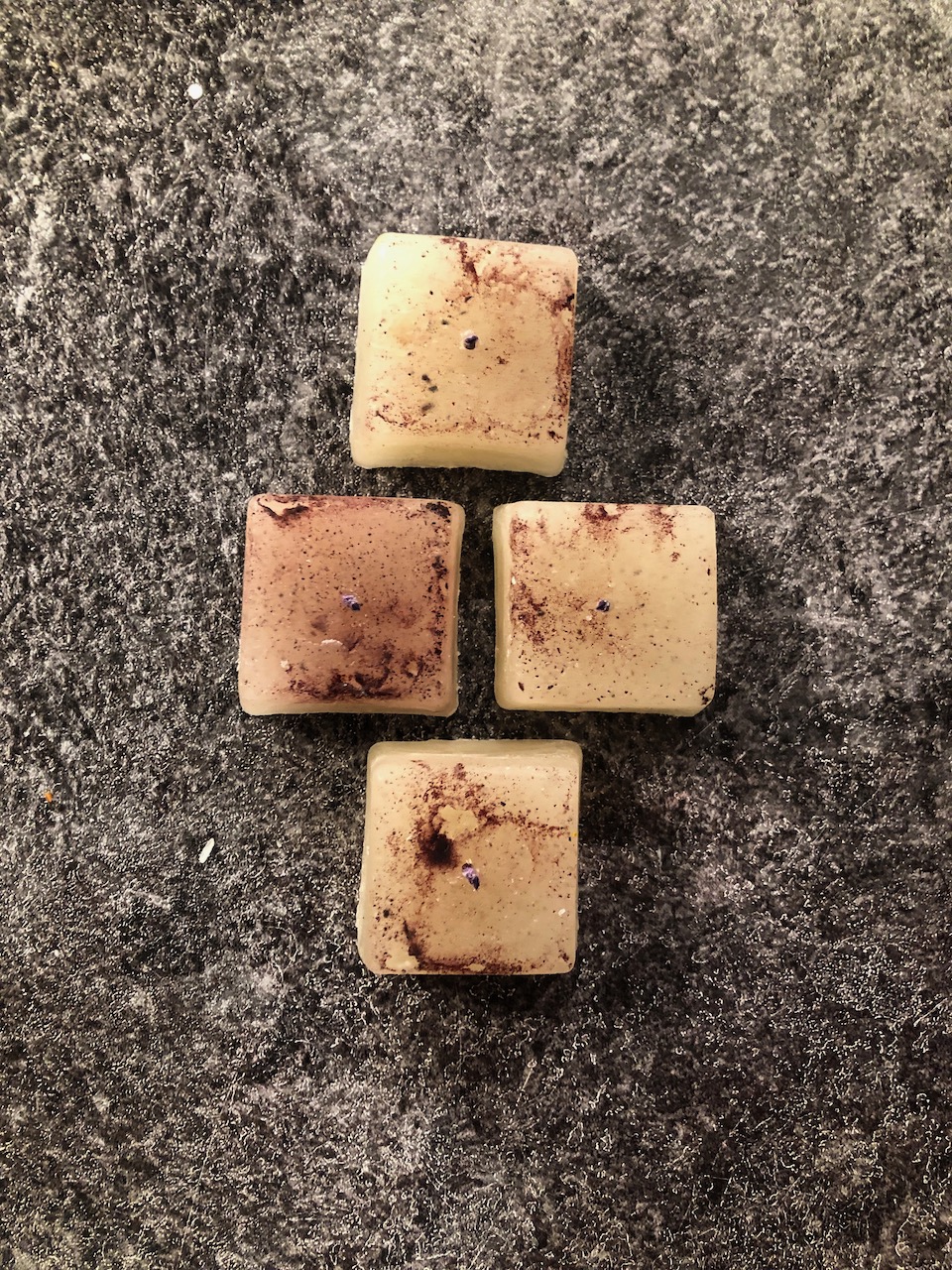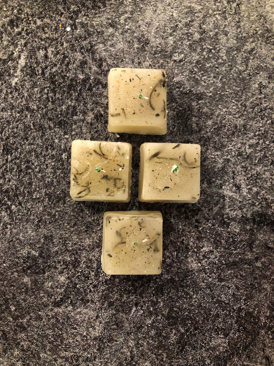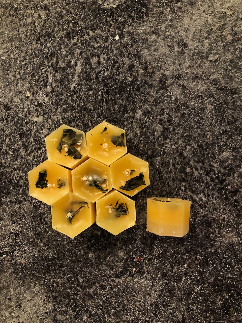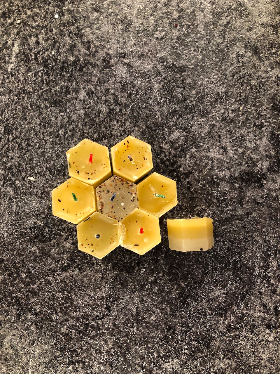 – Yellow, filtered and remelt wax with lemon tea confetti