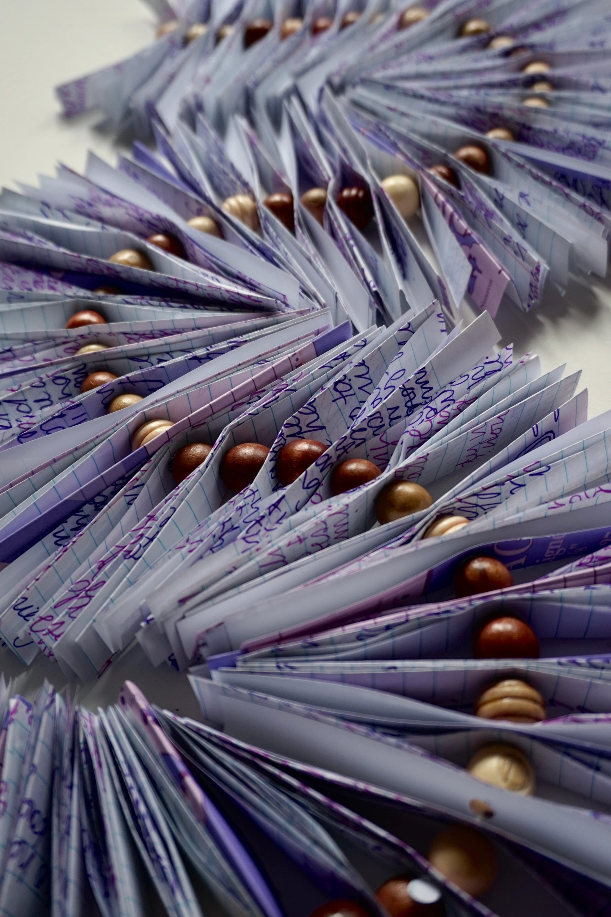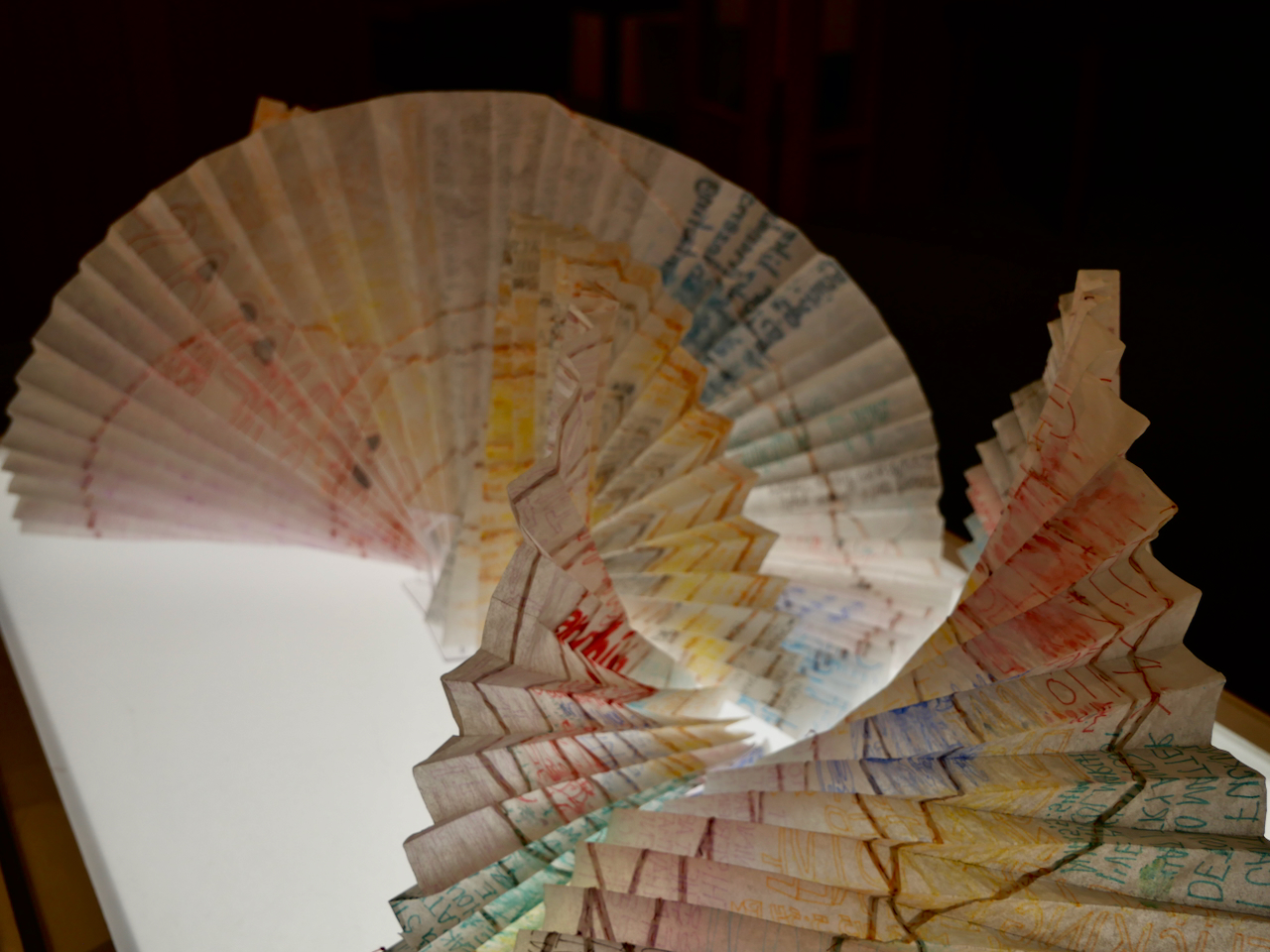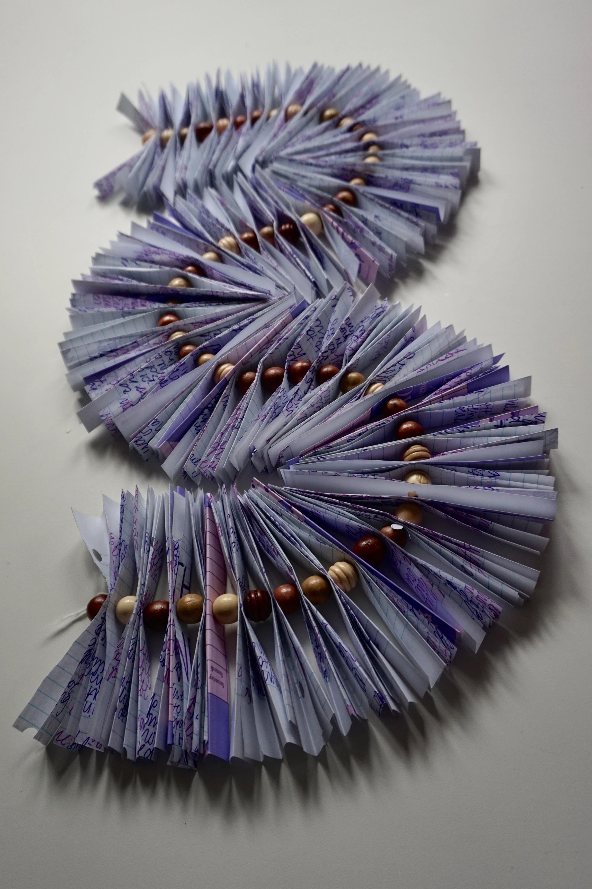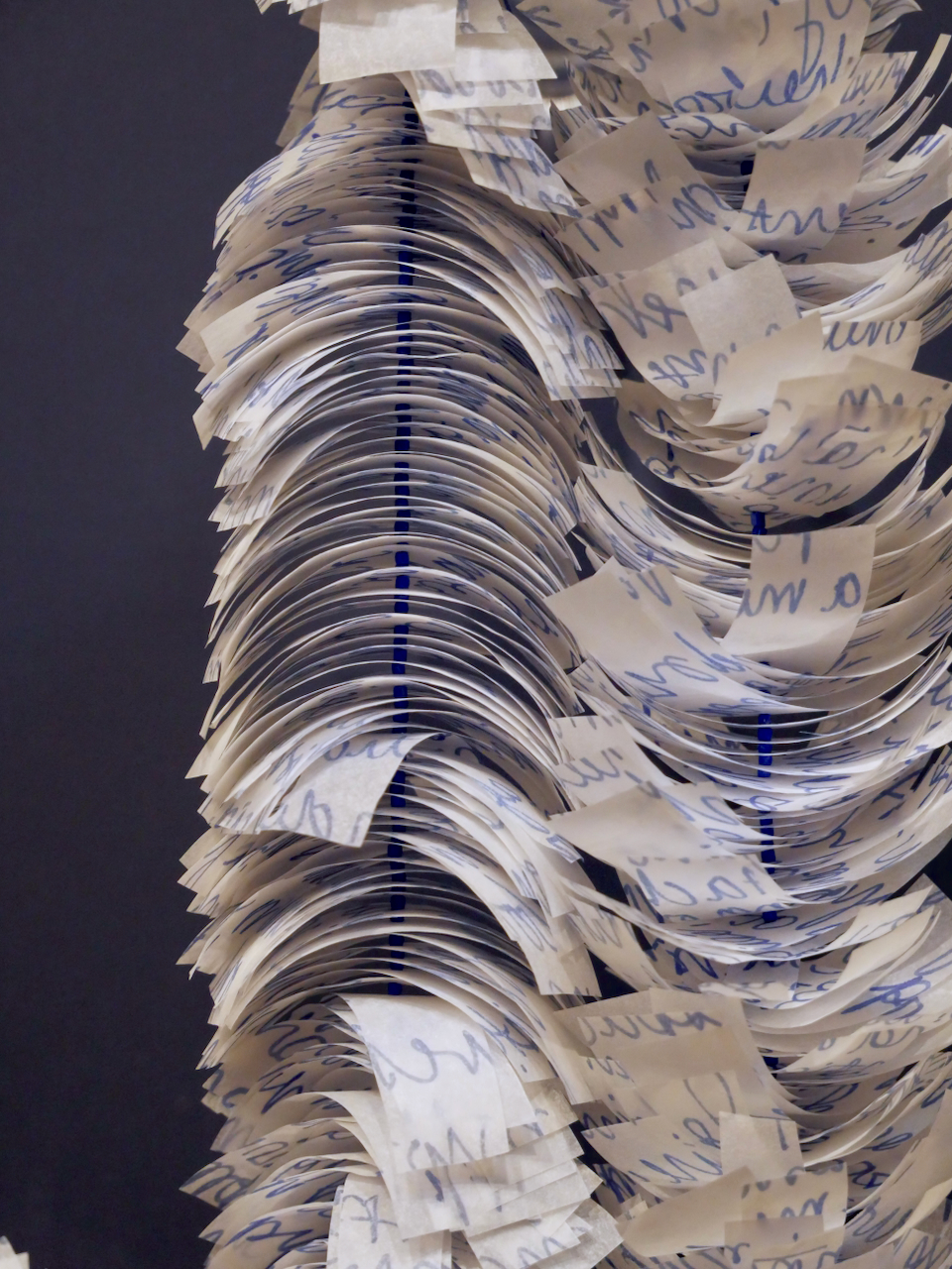 As an act of therapeutic release, I have been journaling and hand-lettering script since childhood, giving physical form to my thoughts and feelings. In Paper Letters, I deconstruct, disfigure, and distort these “sloppy” stream of consciousness writings – old journals, hand-lettered transcriptions of emails and instant messages, and letters written but never sent. The material’s transformation from something smooth, rigid, flat, and fixed in dimension into something irregular, flexible, and three-dimensional parallels the shifting of my stories. Through the repetitive processes of cutting, folding, stitching, and pleating, I transform the original text to the point of redirecting its power; stringing together the remnants to create something new.