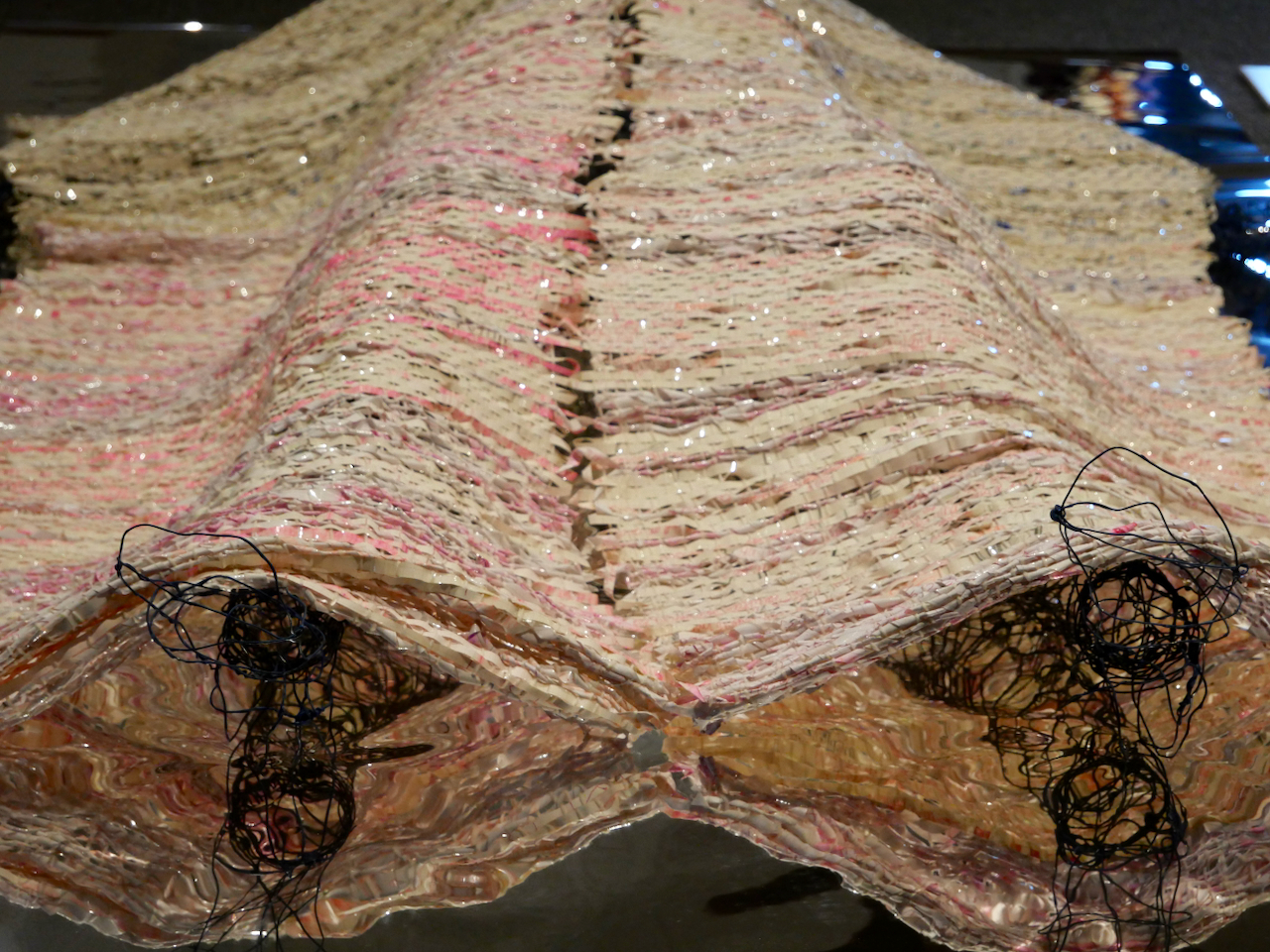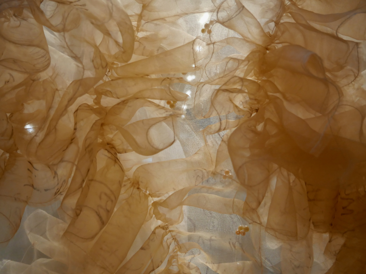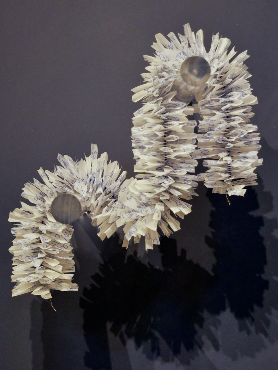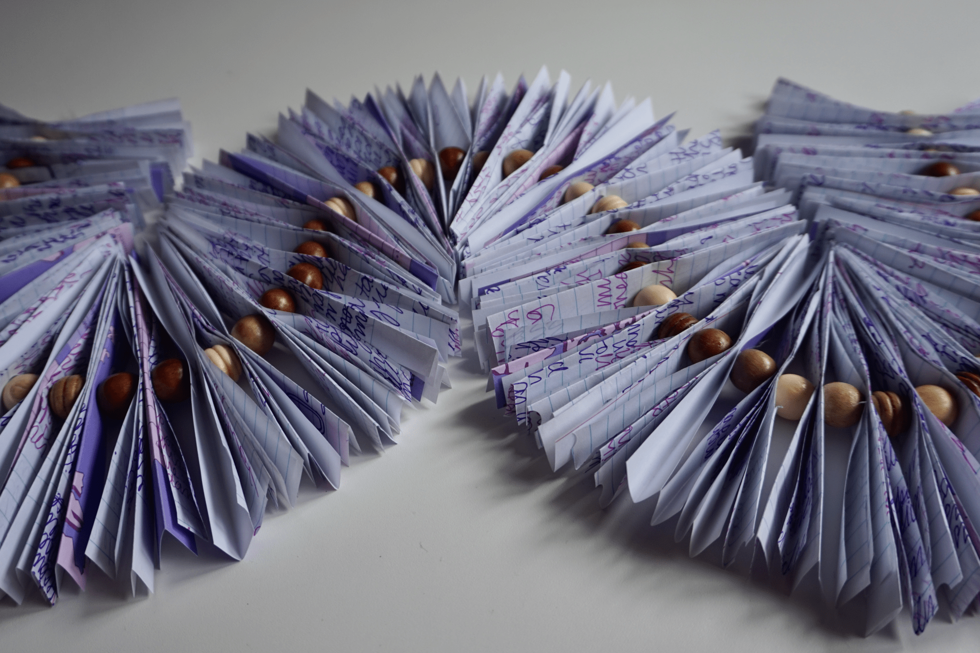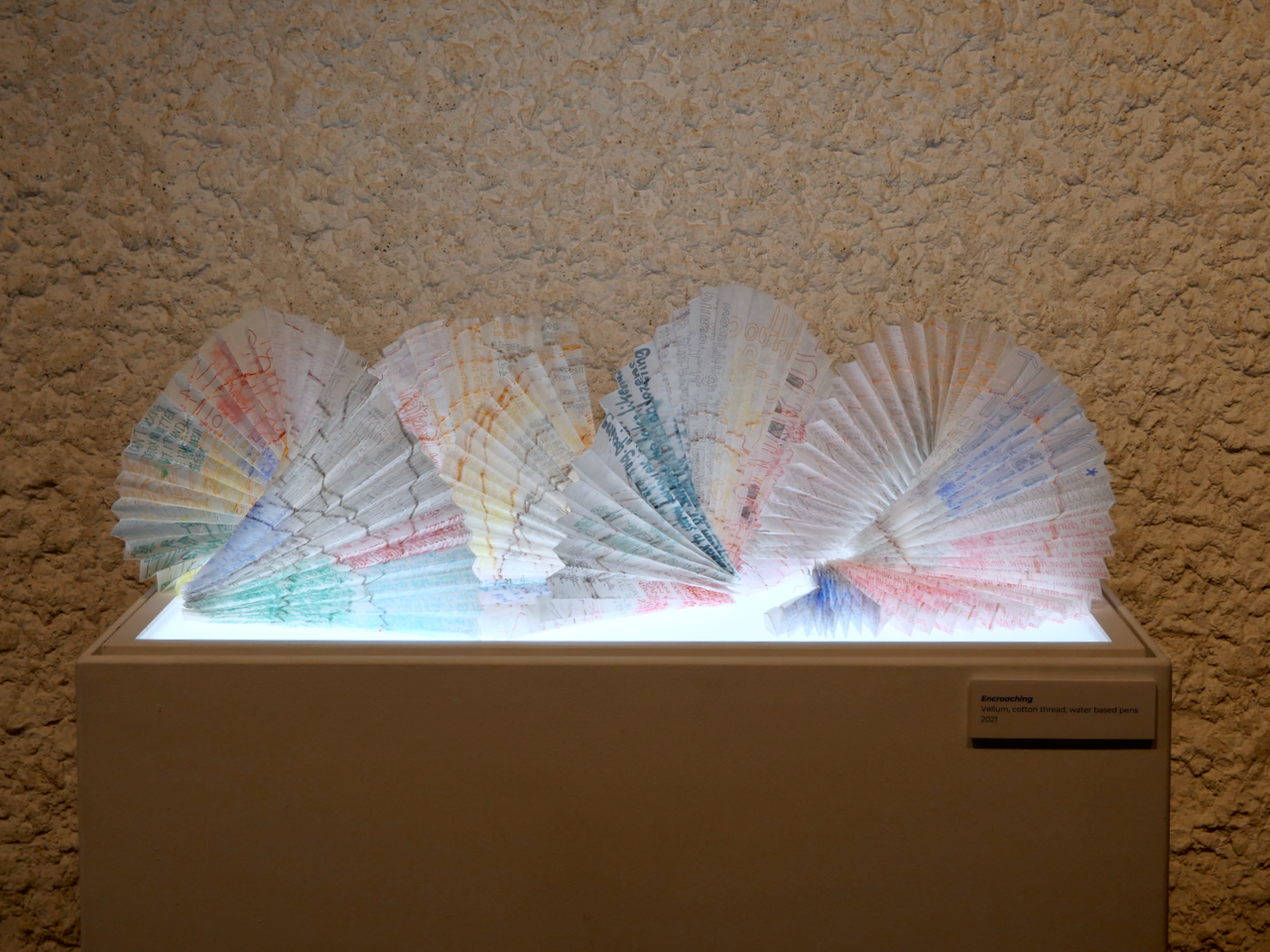 As an act of therapeutic release, I have been journaling and hand-lettering script since childhood, giving physical form to my thoughts and feelings. In Paper Letters, I deconstruct, disfigure, and distort these “sloppy” stream of consciousness writings – old journals, hand-lettered transcriptions of emails and instant messages, and letters written but never sent. The material’s transformation from something smooth, rigid, flat, and fixed in dimension into something irregular, flexible, and three-dimensional parallels the shifting of my stories. Through the repetitive processes of cutting, folding, stitching, and pleating, I transform the original text to the point of redirecting its power; stringing together the remnants to create something new.